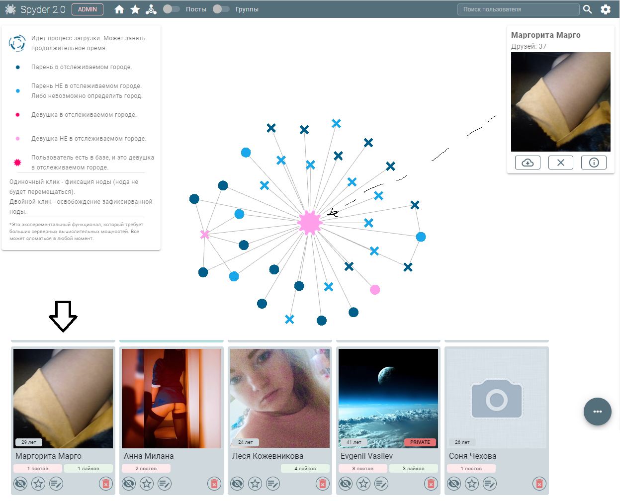 Берем Марго нашу, находим у нее в друзьях Васю. Граф достраивается и теперь мы видим облачко снизу, которое являет собой Васиных подруг. Как мы видим — жирные точки, а также красные крестики — это всё шлюхи из нашего города. По-крайней мере — это женские профили у челика, у которого в друзьях очень много шлюх. 5-рых из них бот и так уже отслеживает (жирные звездочки), а остальных придется смотреть вручную. Иногда бывает так, что шлюпка шлюпует с анкеты, где родной город указан Лос Анжелес. Бот ее тогда не покажет, если только принудительно не заставлять его искать вообще всех тяночек. Но можно добавить конкретно эту писю в отслежку. Бот будет следить за ее активностью, даже если она из Дубая.