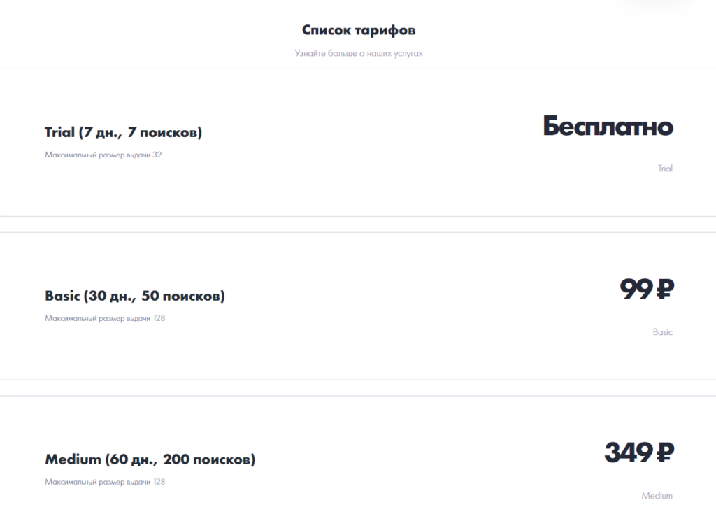 Первый раз у тебя есть 7 дней. И 7 поисков. Хочешь больше дней? Башляешь сотку — получаешь еще месяц и еще 50 поисков. Хочешь больше поисков? Башляешь 350р/900р и получаешь 2/3 месяца, соответственно.
